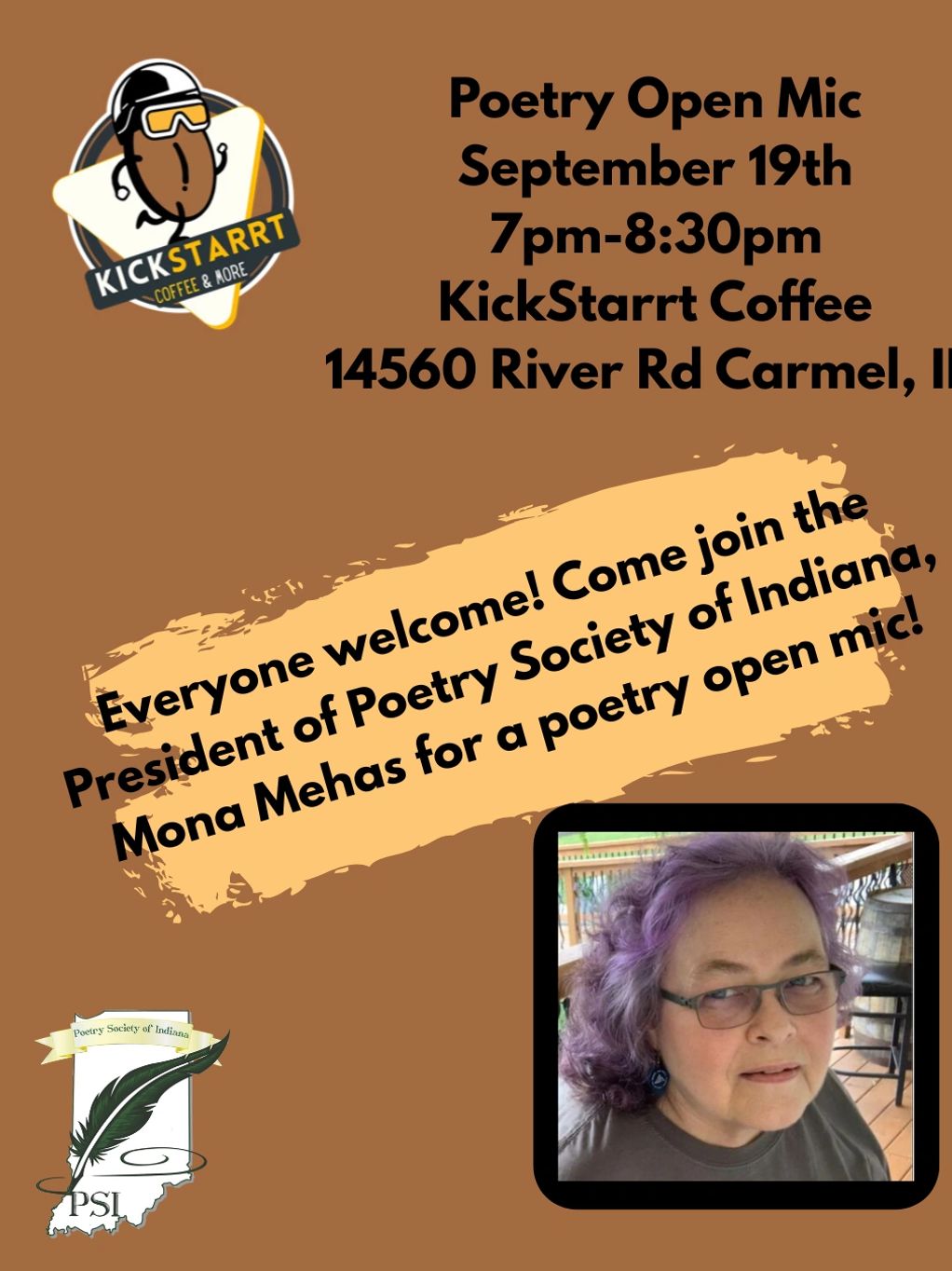 Poetry open mic in Carmel, hosted by president of PSI Mona Mehas.